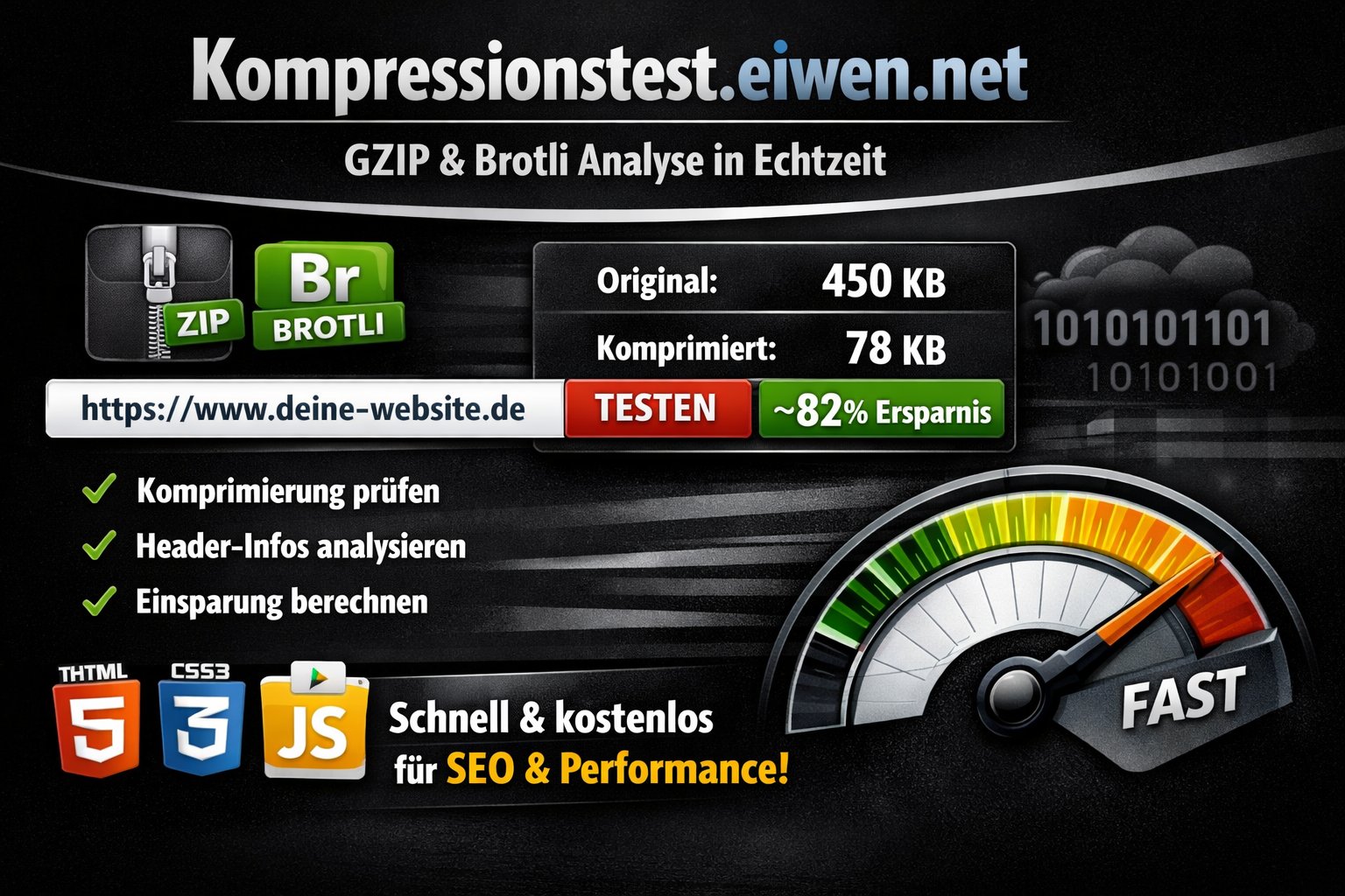 Kompressionstest.eiwen.net ist ein kostenloses Online-Tool, das live prüft, ob eine Webseite oder Datei komprimiert ausgeliefert wird – und wie stark die Datenübertragung dadurch schrumpft. Unterstützt werden öffentlich erreichbare Dateien wie HTML, CSS, JavaScript, JSON und Bilder.