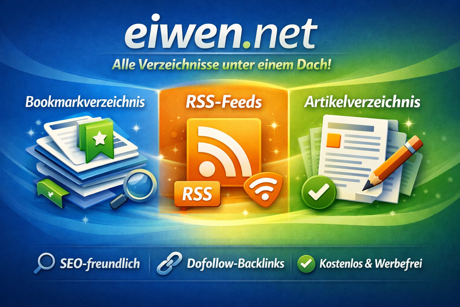 Eiwen.net kombiniert drei Funktionen in einem Portal: Bookmarkverzeichnis, RSS-Feed-Verzeichnis und Artikelverzeichnis. Mit nur einer Anmeldung lassen sich Favoriten verwalten, RSS-News verfolgen und eigene Artikel veröffentlichen. Die Plattform ist kostenlos nutzbar und bietet Dofollow-Backlinks, was sie zu einer attraktiven Möglichkeit für Webseitenbetreiber und Autoren macht, ihre Inhalte sichtbarer zu machen und neue Besucher zu erreichen.