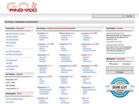 Go-Findyou.de ist eine deutschsprachige Kombination aus Suchmaschine und Webverzeichnis. Die Plattform bietet sowohl privaten als auch gewerblichen Webseiten eine Möglichkeit, sich thematisch sortiert zu präsentieren und leichter gefunden zu werden. Über 500 Kategorien und mehr als 12.000 eingetragene Seiten machen Go-Findyou zu einem der umfangreicheren Webkataloge im deutschsprachigen Raum.